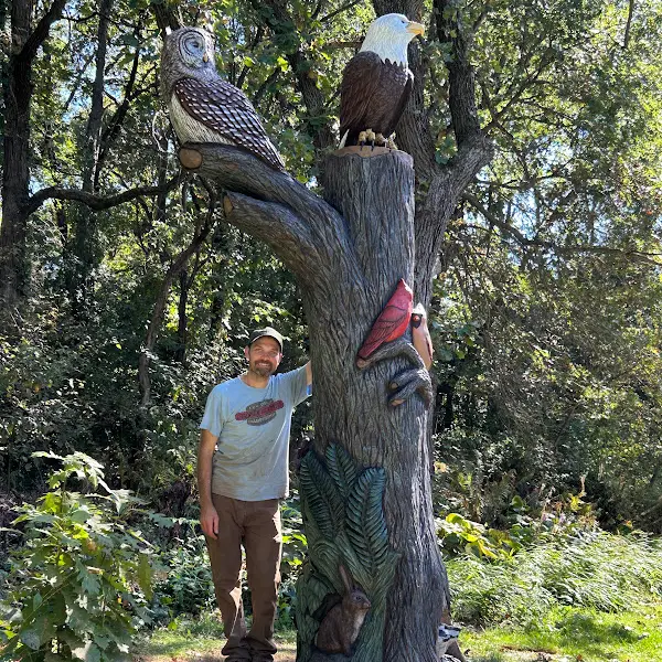 Our names are Garret and Jessi Wendlandt, and we are a husband and wife team that create original, one-of-a-kind carvings out of wood and stone. We live in the town of Oasis in Wisconsin on an enchanting 6 acre forested property that we call the Wendlandt Oasis.
