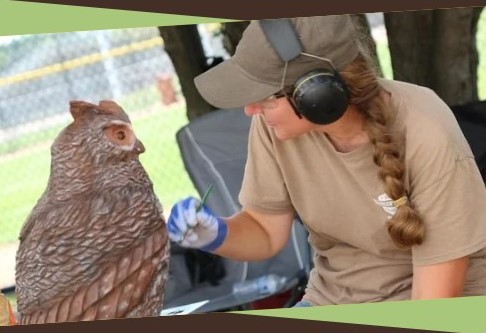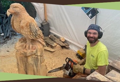 Garret was born and raised in Door County, Wisconsin and was first introduced to 3D art through a class where he learned Norwegian flat-plane carving. In 2010, he was introduced to chainsaw carving after attending a chainsaw competition in Pennsylvania, and a chainsaw has been his tool of choice ever since when creating wood into art. Also working as a landscaper in Door County for over 12 years, Garret also grew to love stonework and ventured into stone carving as well around 2010. Whether in wood or stone, Garret enjoys carving content that is nature-based, especially wildlife. However, Garret often takes on new subject materials and is not afraid to venture outside of wildlife and has carved other subjects like dragons, pets, and memorials. Garret always believes in taking the time to provide a quality work of art through paying close attention to detail and by working with his clients on design and throughout the carving process.